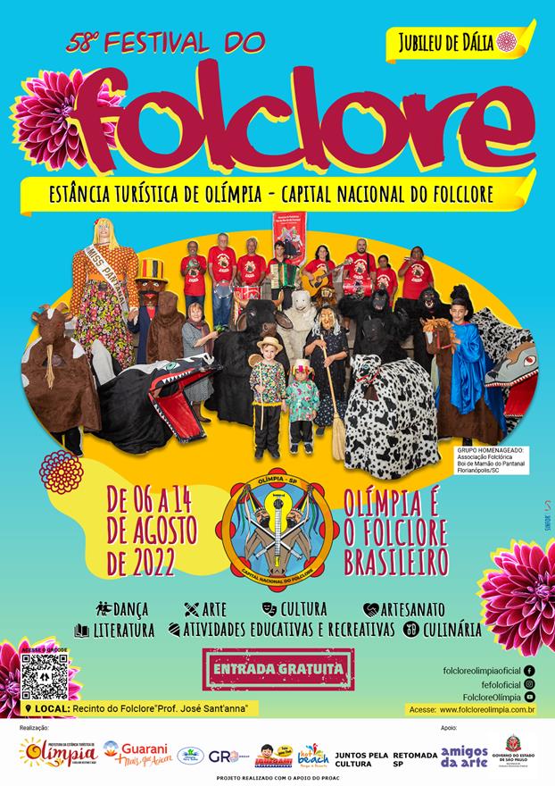 A Estância Turística de Olímpia, Capital Nacional do Folclore, entra, a partir desta quarta-feira (06), na contagem regressiva para o 58ª Festival do Folclore, que, após dois anos, voltará a ser presencial, de 06 a 14 de agosto de 2022, no Recinto do Folclore.