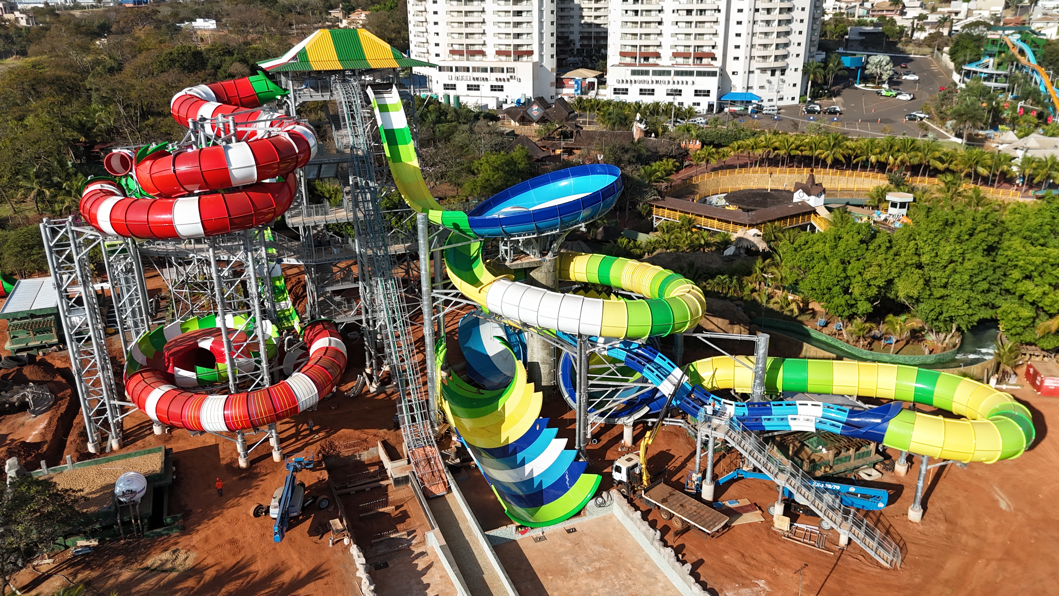 A WhiteWater destacou o Complexo Nações como um marco de inovação e escala no Brasil. O projeto de 33 metros de altura está em fase final de montagem e contará com oito experiências diferentes, celebrando a identidade do parque com as descidas temáticas Brasil e Itália.